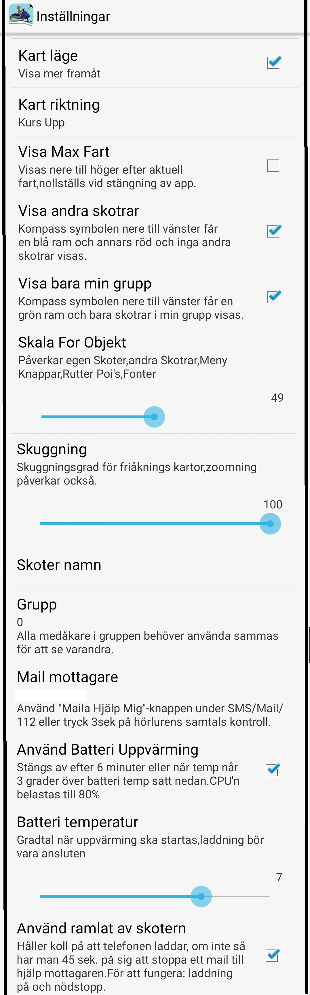 Knappar: För att zooma på kartan kan plus och minus knapparna på telefonen användas. Retur knappen kan användas för av-/aktivera Följ skoter. När "Följ-Skoter" är aktiv är skärmen låst, använd då plus och minus knapparna för att "zooma". Har man en hörsnäcka eller bluetooth med volymknappar, så kan styra appen via denna.